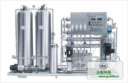 原水 → 原水箱 → 原水泵 →多介質(zhì)過濾器 (石英砂過濾器)→活性炭過濾器 →軟水處理器(添加阻垢劑裝置) → 精密過濾器 → 高壓泵 → 一級反滲透(RO)裝置 →紫外線殺菌裝置(臭氧殺菌裝置) → 用水點
