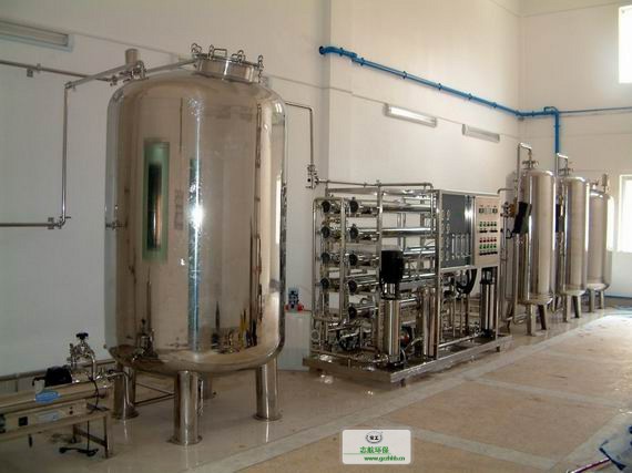 2.原水箱→原水增壓泵→多介質(zhì)過濾器→活性炭過濾器→軟水器→保安過濾器→第一級反滲透→PH調(diào)節(jié)→中間水箱→第二級反滲透→純水箱→中間水泵→EDI系統(tǒng)→純化水箱→殺菌系統(tǒng)→純化水輸送泵→紫外線殺菌器→微孔過濾器→用水點(diǎn)