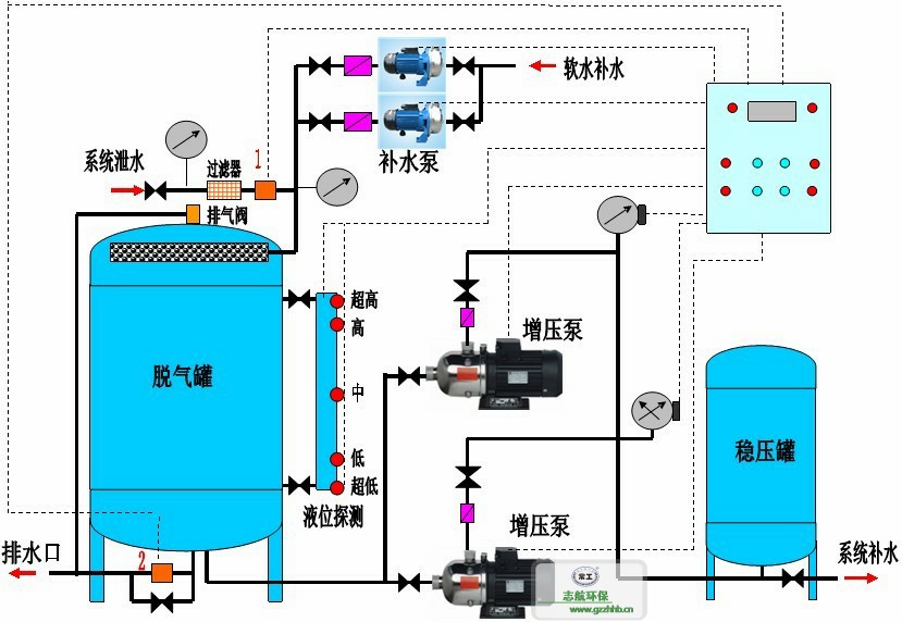 定壓補水裝置設備采用系統(tǒng)靜壓作為膨脹水箱內(nèi)的設計初始壓力水頭,采用保證系統(tǒng)內(nèi)熱水不汽化的壓力作為膨脹水箱內(nèi)動行終端壓力水頭。