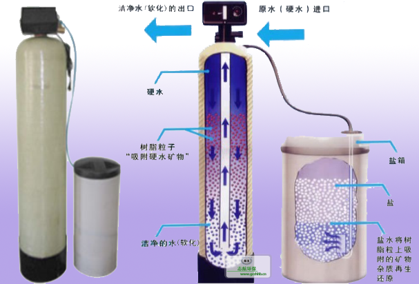 由于水的硬度主要由鈣、鎂形成及表示,故一般采用陽離子交換樹脂(軟水器),將水中的Ca2+、Mg2+(形成水垢的主要成份)置換出來,隨著樹脂內(nèi)Ca2+、Mg2+的增加,樹脂去除Ca2+、Mg2+的效能逐漸降低。
